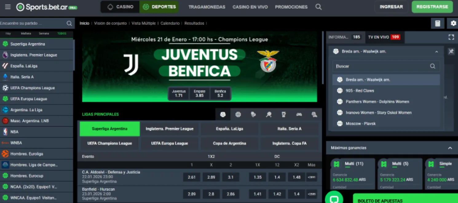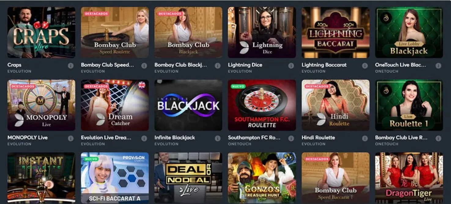 | Live Casino | Evolution, Pragmatic Play Live, Playtech Live | Streaming en vivo por servers CDN; variantes de ruleta, blackjack, baccarat y game shows. Soporte de crupieres en español habitual para mercado AR. |